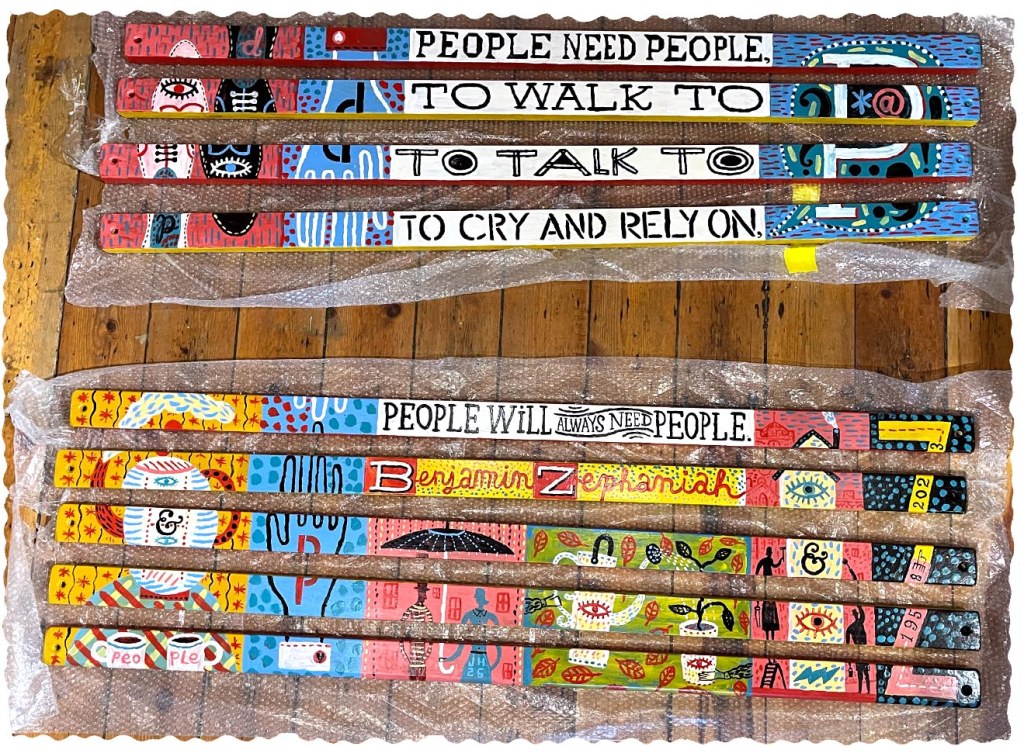 A day or so after my speil to the council, Andrew Gooding & Suzanne asked if I’d like to paint a bench for the town centre. Of course, I said yes. I’d painted a couple of benches for my local city centre in Southampton – they were great fun to do. And the brief was simple – include five lines form a poem by another Bloodaxe star, Benjamin Zephaniah. Well, what an honour! I still find it odd to think that Handsworth’s finest is no longer with us.